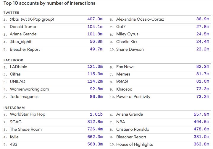 Với thành tích này, BTS đã bỏ xa những nhân vật nổi tiếng khác như Tổng thống Donald Trump (104 triệu tương tác), Ariana Grande (101,8 triệu tương tác)… Trong top 10, tài khoản Twitter của Big Hit cũng đứng thứ 4 với 56,8 triệu lượt tương tác. Nhân vật Kpop duy nhất khác trong top 10 là nhóm nhạc nam GOT7 với 27,8 triệu lượt tương tác.