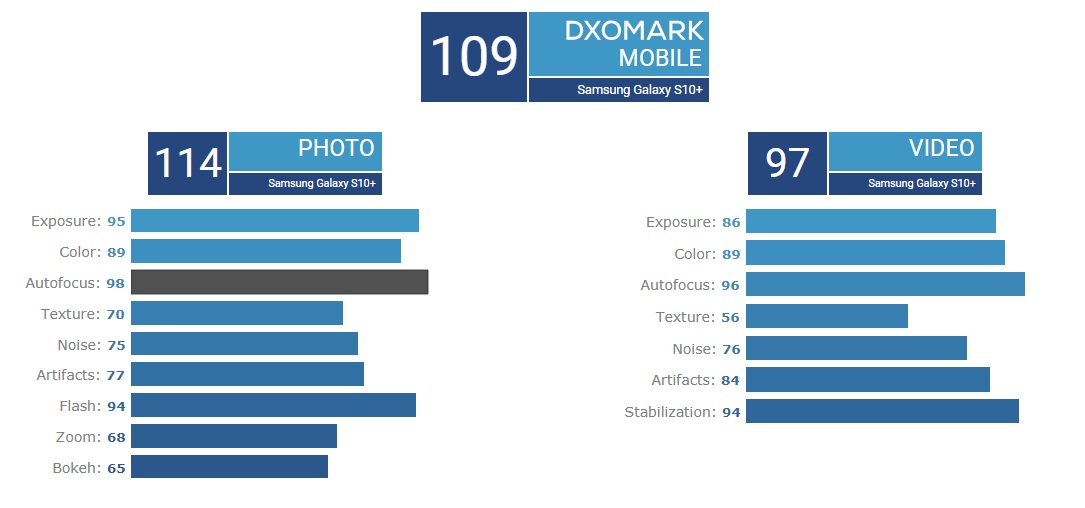 DxOMark đánh giá rất cao camera của Galaxy S10+ ví dụ như khả năng cân bằng trắng chính xác, hiển thị màu sắc tốt trong các tình huống, chụp thiếu sáng ít bị noise cũng như chất lượng ảnh xóa phông đẹp và sắc nét.