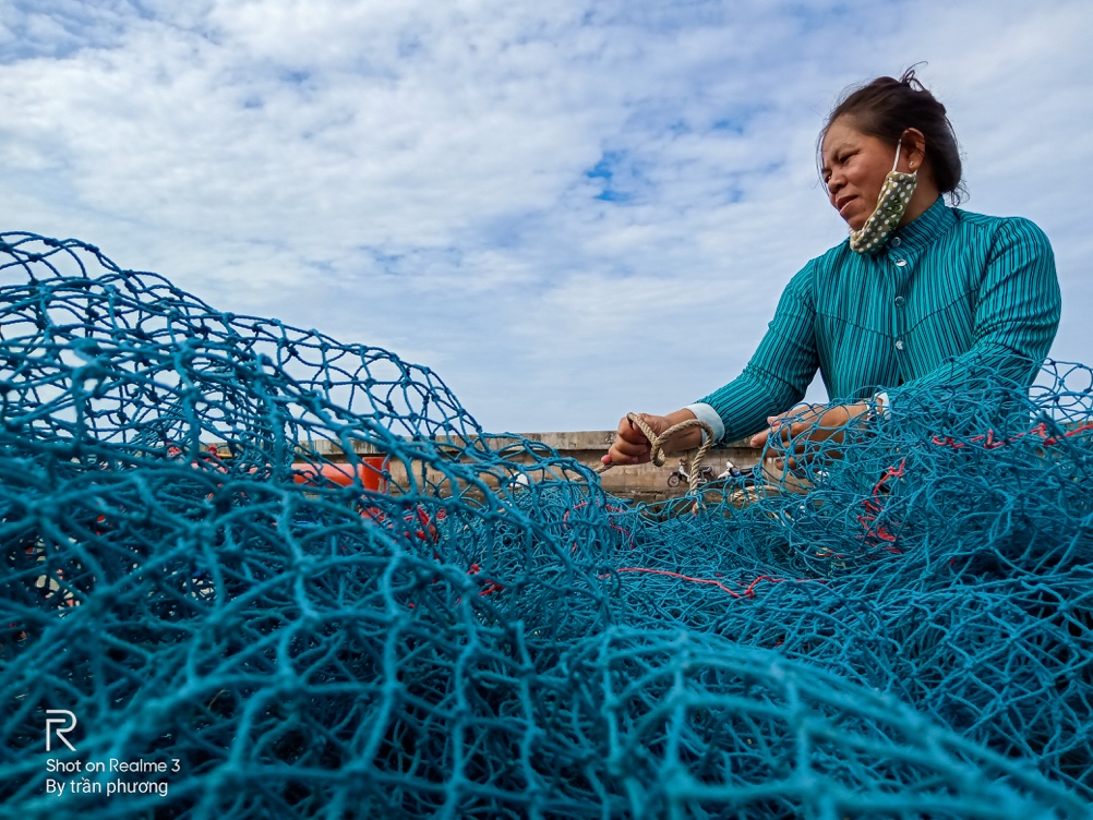 Người dân thu gọn lại lưới sau chuyến đánh bắt, màu xanh của lưới, màu mây màu trời và màu da của nhân vật có phần rực hơn, nhưng nổi khối và không bị bết dính.