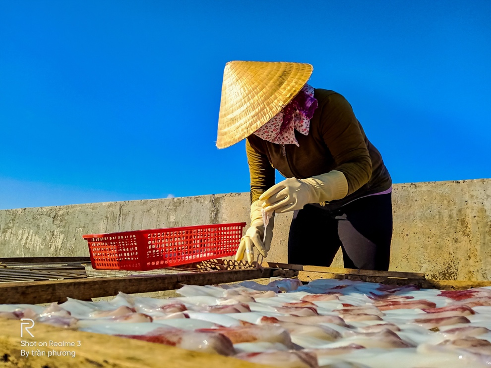 Dù mặt trời lên cao, nắng gắt hơn nhưng những người ngư dân vẫn miệt mài lao động.