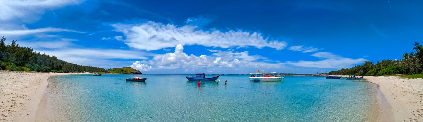Trời xanh, mây trắng, cát vàng và nước biển trong veo.