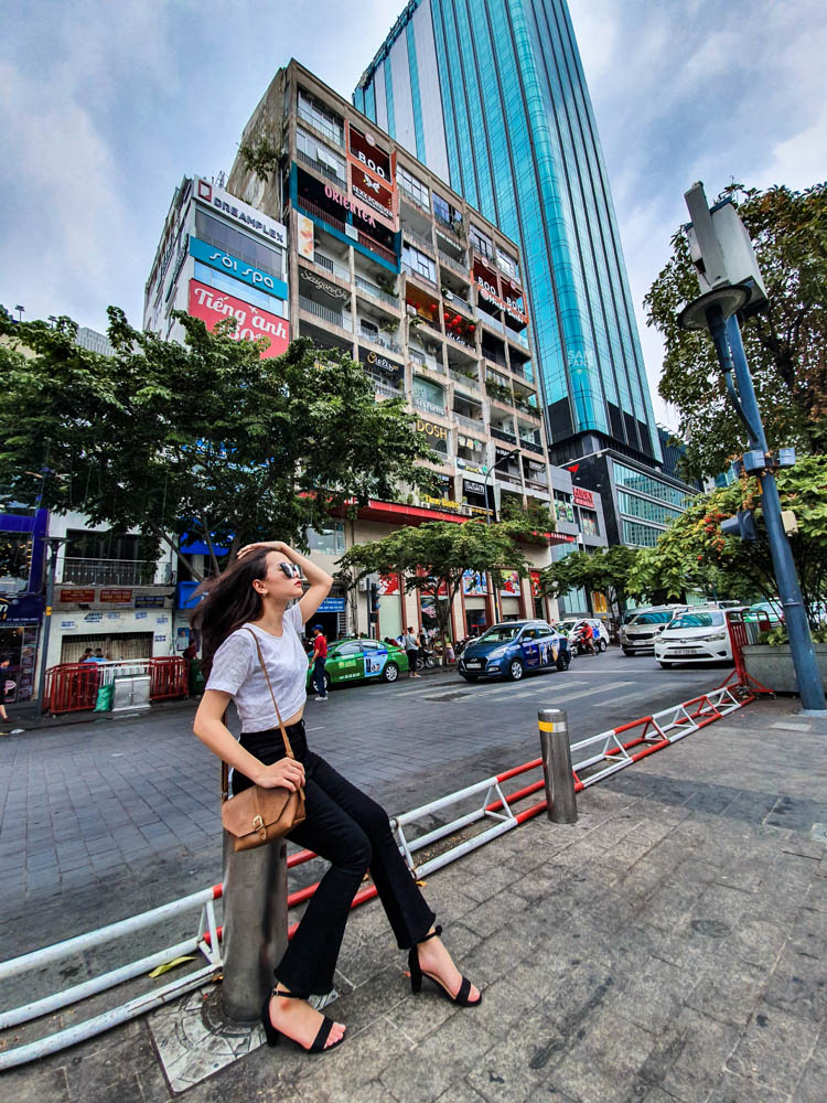 Chân dài miên man với camera góc siêu rộng luôn mà bạn nhớ đứng giữa khung hình để người mình không bị biến dạng do hiệu ứng của ống kính góc siêu rộng gây ra nhé. (Nguồn: Samfans Community Vietnam)