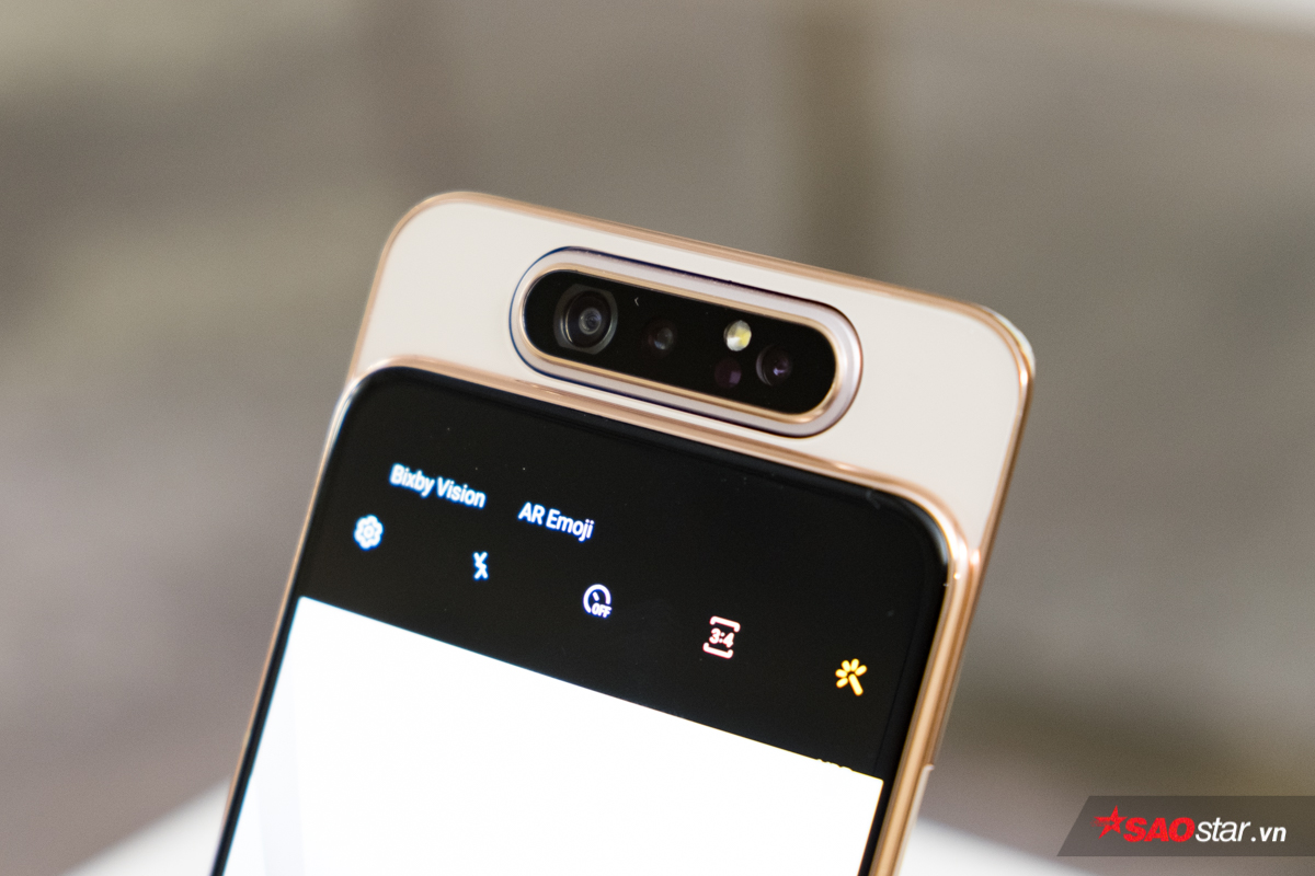 Theo đó, hệ thống camera của Galaxy A80 đã được thiết kế riêng biệt theo dạng trượt lên, có thể xoay 180 độ để vừa là camera chính phía sau, vừa là camera selfie trước. Camera này sẽ được bật xoay tự động khi người dùng cần sử dụng camera trước.