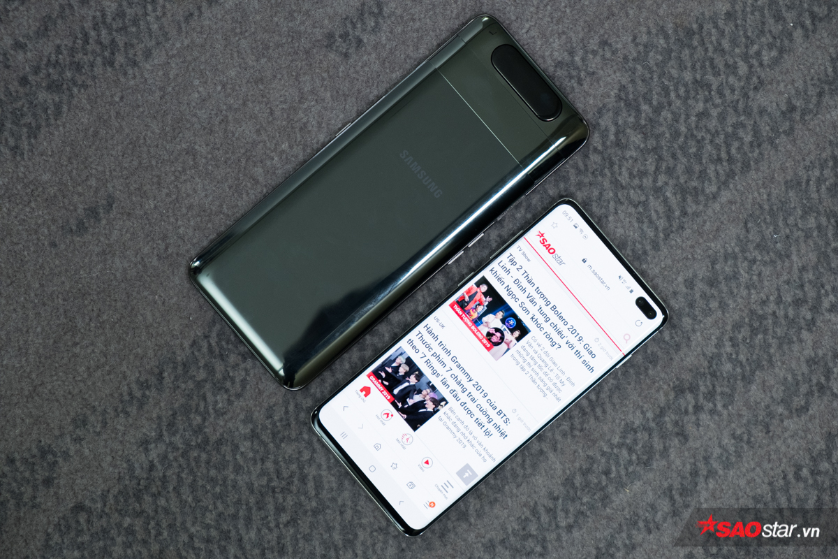 Khi so với Galaxy S10+, A80 có phần dài hơn và có màn hình tràn viền Full view thực sự nhờ trang bị cụm camera xoay độc đáo.