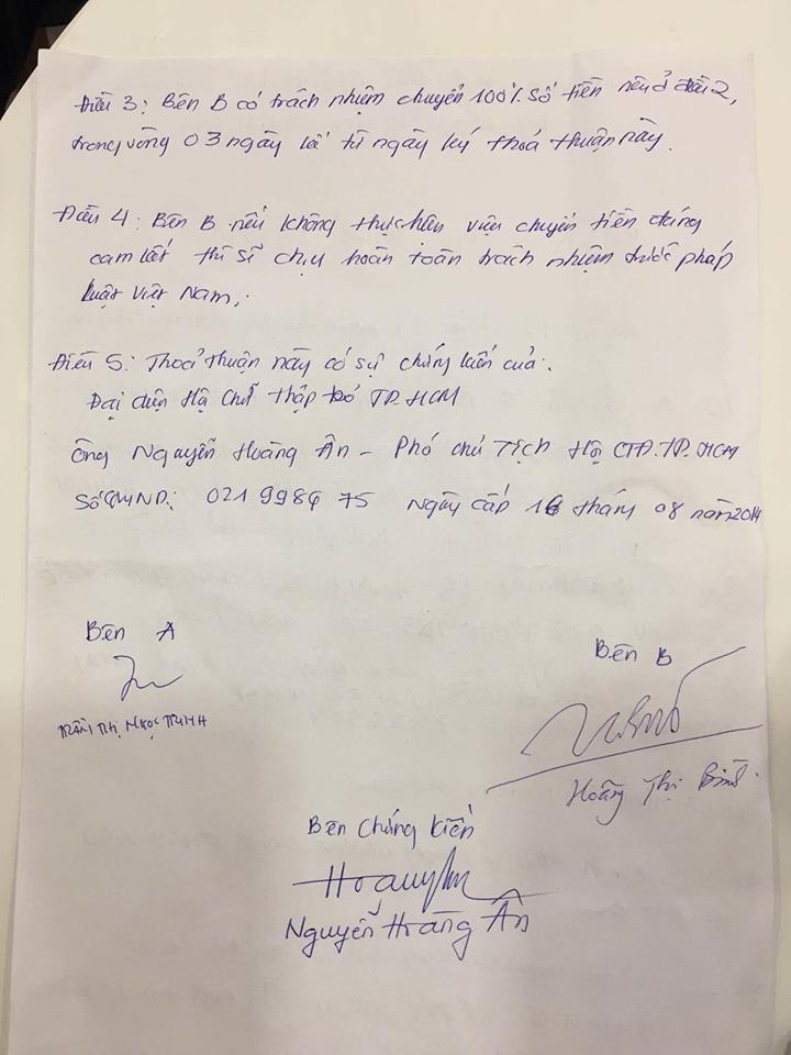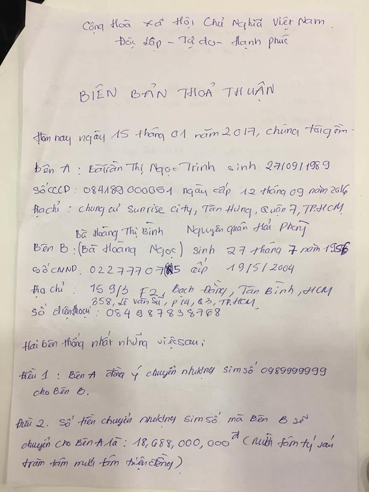 Ông bầu Vũ Khắc Tiệp cũng đưa ra biên bản thỏa thuận giữa Ngọc Trinh và người phụ nữ này làm bằng chứng.