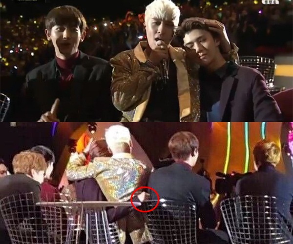 Phân cảnh huyền thoại tại MAMA 2015, những tưởng Sehun đang thoải mái tựa vai tiền bối Seungri nhưng thật ra phía sau đang níu áo Chanyeol vì mắc cỡ.