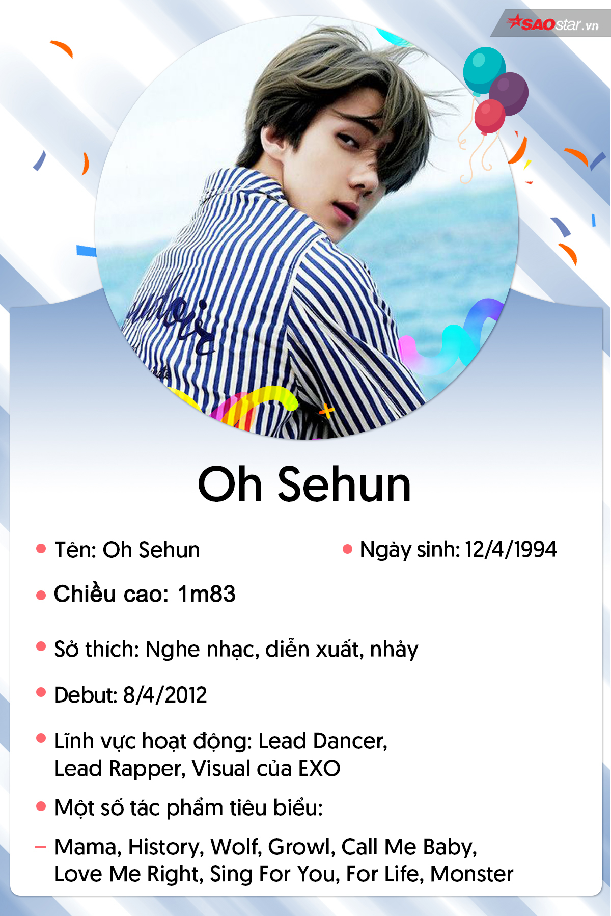 Thời gian trôi qua thật nhanh, EXO “chân ướt chân ráo” ngày nào giờ đã là boygroup hàng đầu Kpop. Sehun cũng từ một chàng trai rụt rè, ngại giao tiếp đã hoạt ngôn, mở lòng với fan hơn, cũng là người bị chê bất tài giờ có cả màn trình diễn solo do mình tự sáng tác, biên đạo trong concert của nhóm hay chính xác nhất là từ 1 cậu nhóc bám dính các anh lớn “đòi trà sữa” trở thành chàng trai lịch lãm vạn người mê. Hôm nay, nhân ngày sinh nhật của em út Sehun, hãy cùng nhau điểm lại đôi nét về anh chàng này nhé!