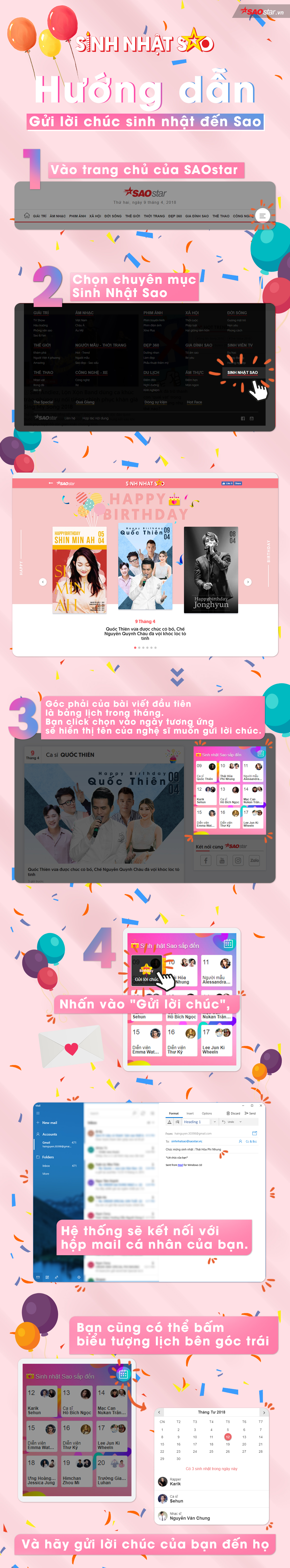 Mỗi năm một lần, ngày sinh nhật là dịp đặc biệt để người hâm mộ bày tỏ tình cảm cho idol của mình. Với tinh thần ấy, SAOstar mở ra hộp thư qua địa chỉ: sinhnhatsao@saostar.vn để các fan có thể nhắn nhủ vào đó tất cả tâm tư tình cảm. SAOstar sẽ chọn ra những email ý nghĩa nhất và đăng tải trong chuyên mục Sinh Nhật Sao vào đúng ngày “người thương” của bạn cất tiếng khóc chào đời. Chi tiết vui lòng xem hướng dẫn như bên dưới nhé!