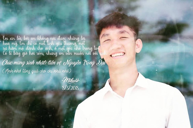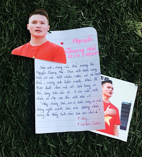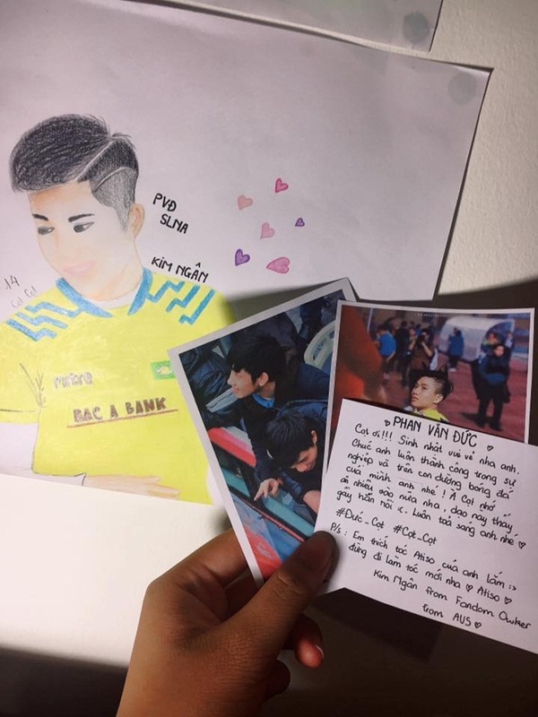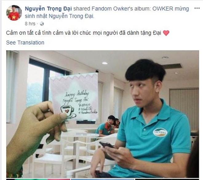 Chàng cầu thủ điển trai được fandom “Owker” tặng hẳn 1 project mừng sinh nhật rất đáng yêu. Theo đó người hâm mộ sẽ chọn bất kỳ nơi nào có liên quan tới bóng đá, sau đó chụp lại những lời chúc để gửi đến anh. Khỏi phải nói Trọng Đại cảm động với tình cảm này thế nào, còn nhanh tay đăng lên trang cá nhân để cám ơn cũng như chia sẻ niềm vui với mọi người.