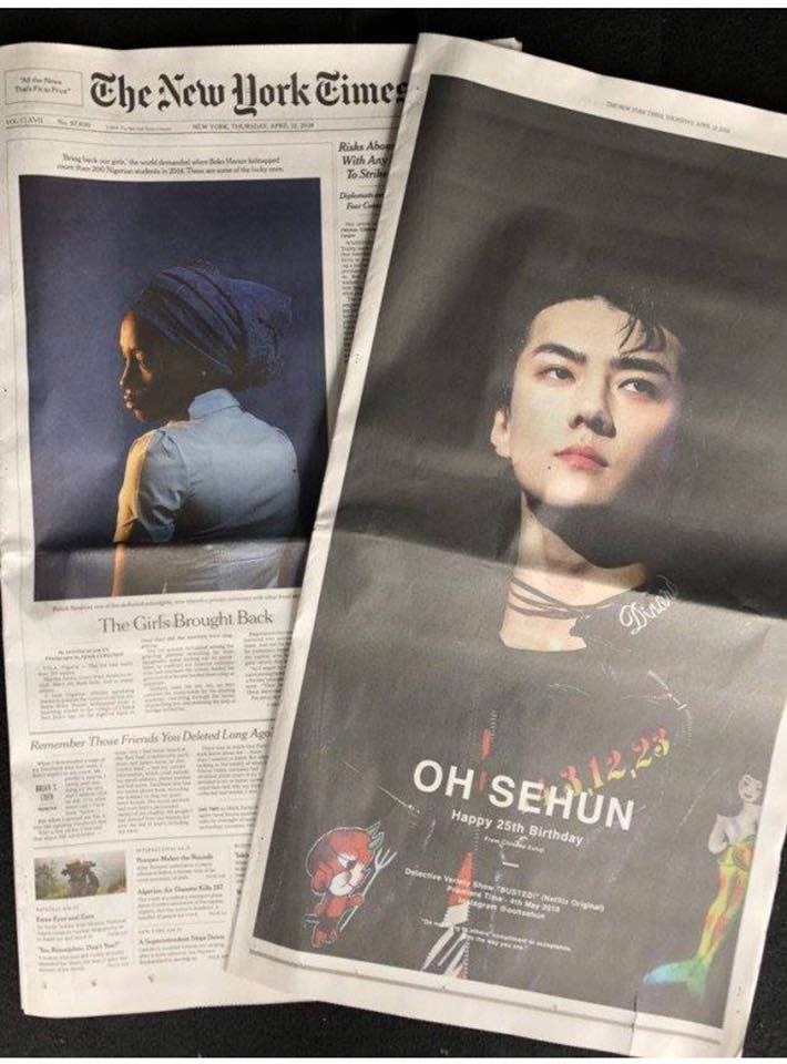 Sehun trở thành thần tượng Hàn Quốc đầu tiên chiếm trọn một trang của tờ báo nổi tiếng này.