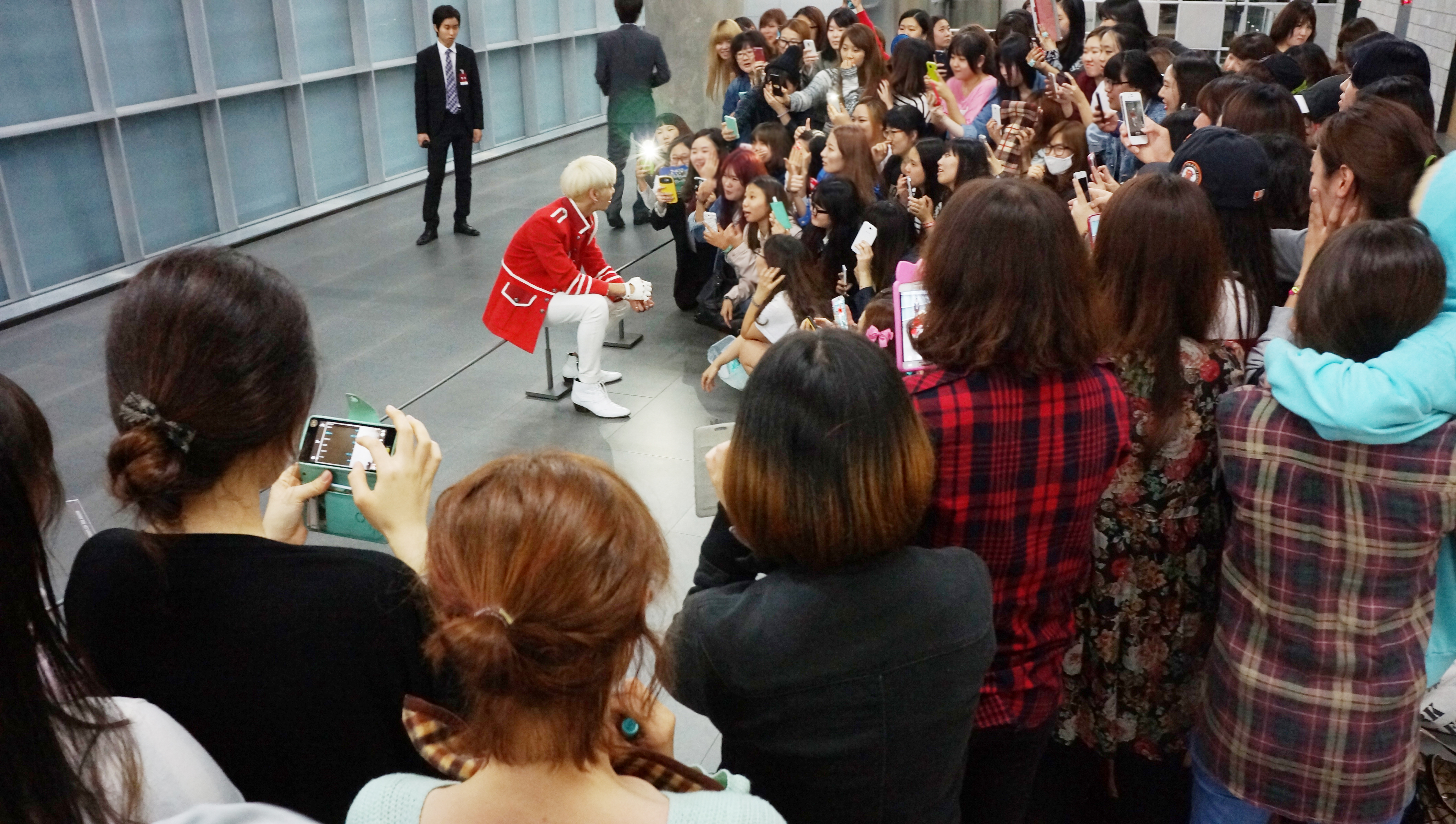 Bất chấp sự ngăn cản của vệ sĩ, anh vẫn trò chuyện ở khoảng cách gần với các fan.