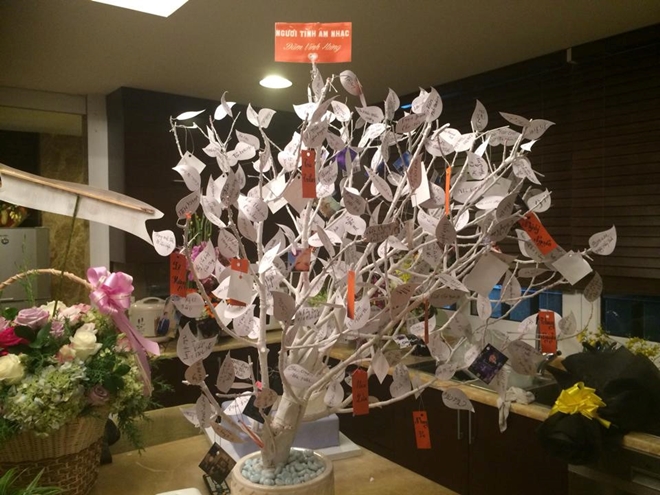 Anh đặc biệt ấn tượng với một cây khô màu trắng với những chiếc lá được viết tên bài hát của mình. Tổng cộng hơn 300 lá, đủ để thấy tâm tư tình cảm của fan dành cho Đàm Vĩnh Hưng nhiều đến thế nào!