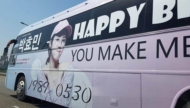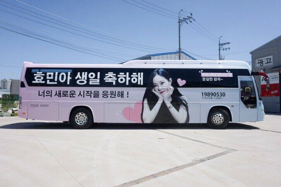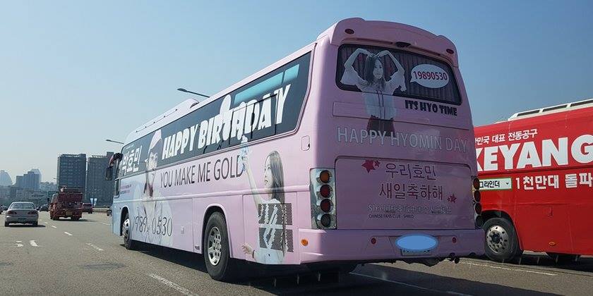 Trước tiên là Hyomin nhé, fan đã thuê hẳn một chiếc xe buýt , trang trí lại và cho chạy vòng quanh Seoul trong vài ngày liên tục.