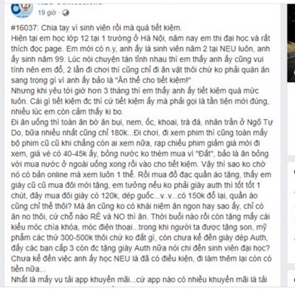 Câu chuyện của cô gái dưới đây trên trang NEU Confessions khi phải ngậm ngùi chia tay bạn trai sinh viên vì anh chàng quá hà tiện đã nhận được rất nhiều sự chú ý của cư dân mạng.