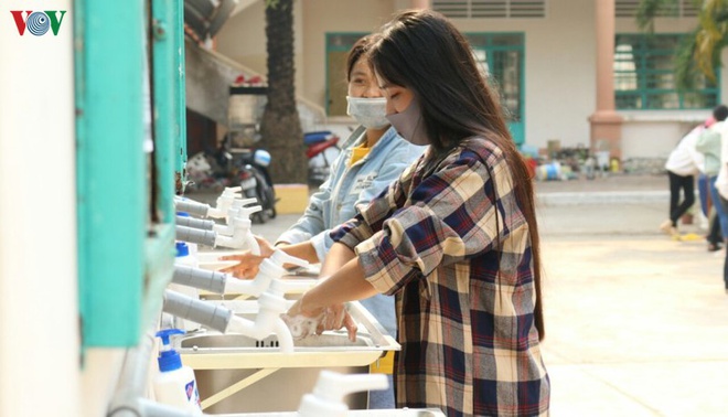 Học sinh rửa tay sát khuẩn khi đến trường. (Nguồn: VOV)