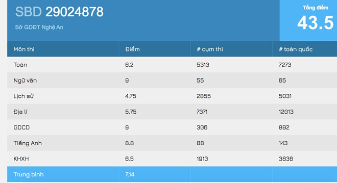 Phi Linh có số điểm thi THPT quốc gia vừa qua được đánh giá không tệ. Tổng điểm 6 môn của 10x là 43,5 điểm, trung bình mỗi môn đạt 7,14.