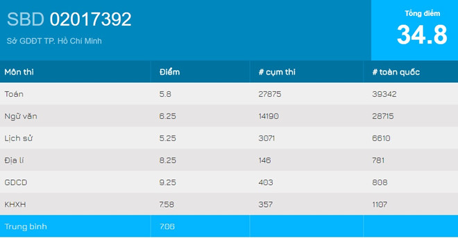Trong đó, Ngữ Văn đạt 9 điểm, Tiếng Anh 8 điểm và GDCD 8,8 điểm. Môn có điểm thi thấp nhất của Linh là Lịch sử - 4,75.