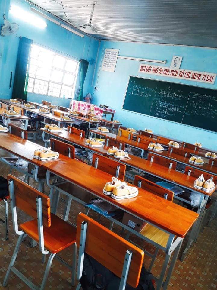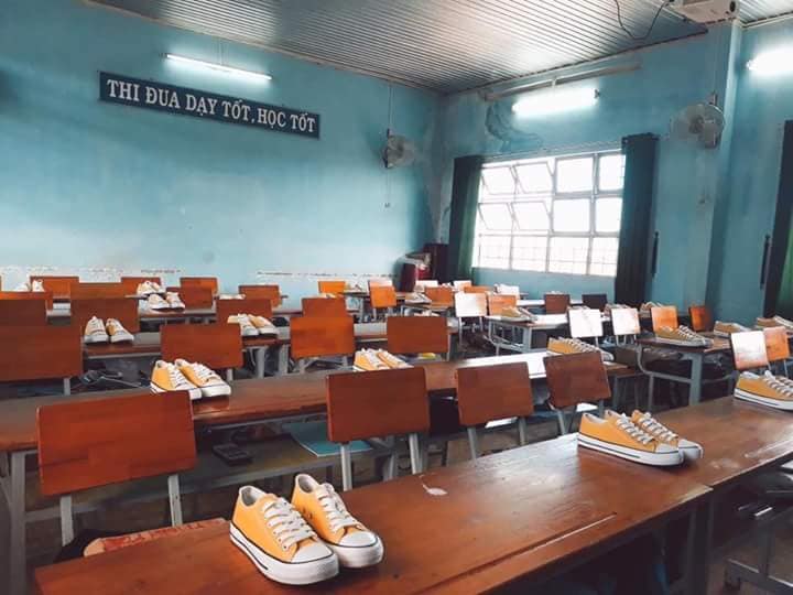 Minh chứng cụ thể nhất là mới đây trên một group đông người theo dõi, một nữ sinh đã khoe đồng phục giày của lớp bên cạnh toàn những đôi Converse màu cam, giống hệt màu của mặt bàn. Đặt trong không gian lớp học không còn ai, những đôi giày được đặt tên bàn và phía trên là bảng xanh, phấn trắng… chúng trở nên thật nổi bật.