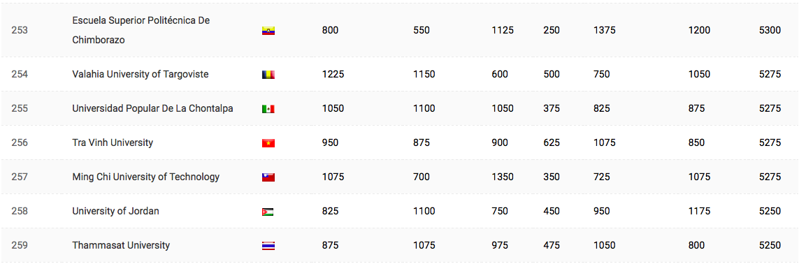 Trong đó, Đại học Tôn Đức Thắng xếp thứ hạng 182 với tổng điểm 5675; riêng Đại học Trà Vinh xếp thứ hạng 256 với tổng điểm 5275.