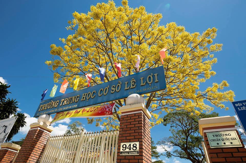 Những ngày này, học sinh trường THCS Lê Lợi ở 948 Hùng Vương, thị trấn Di Linh, huyện Di Linh, tỉnh Lâm Đồng đang được ngắm tận mắt màu vàng rực rỡ của hoa phượng nở rơi phủ kín cả sân trường. Những hình ảnh cây hoa phượng trong trường được bạn Nguyễn Ngọc Kiều Trinh đăng tải trên MXH khiến bao người trầm trồ, ghen tị và đều xao xuyến bởi vẻ đẹp lung linh của nó.