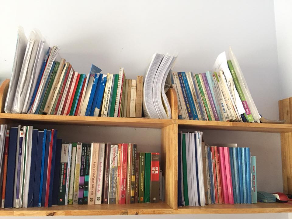 Tủ sách vở của cô bạn với những giáo trình dày cuộm.