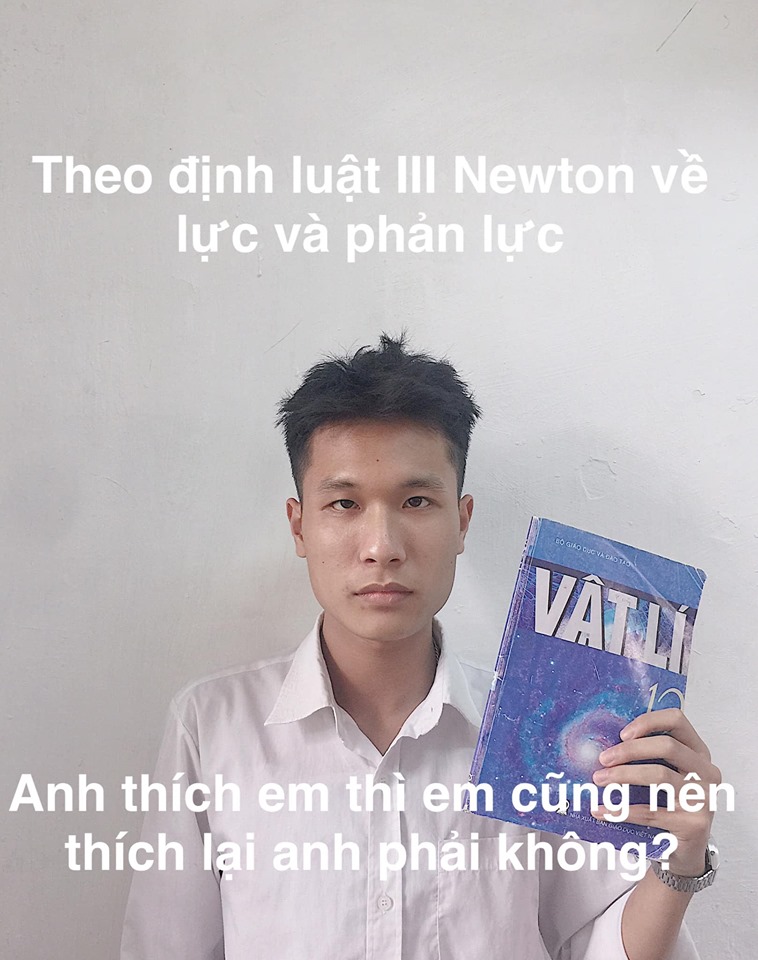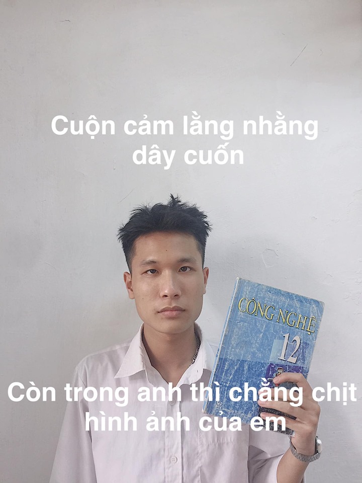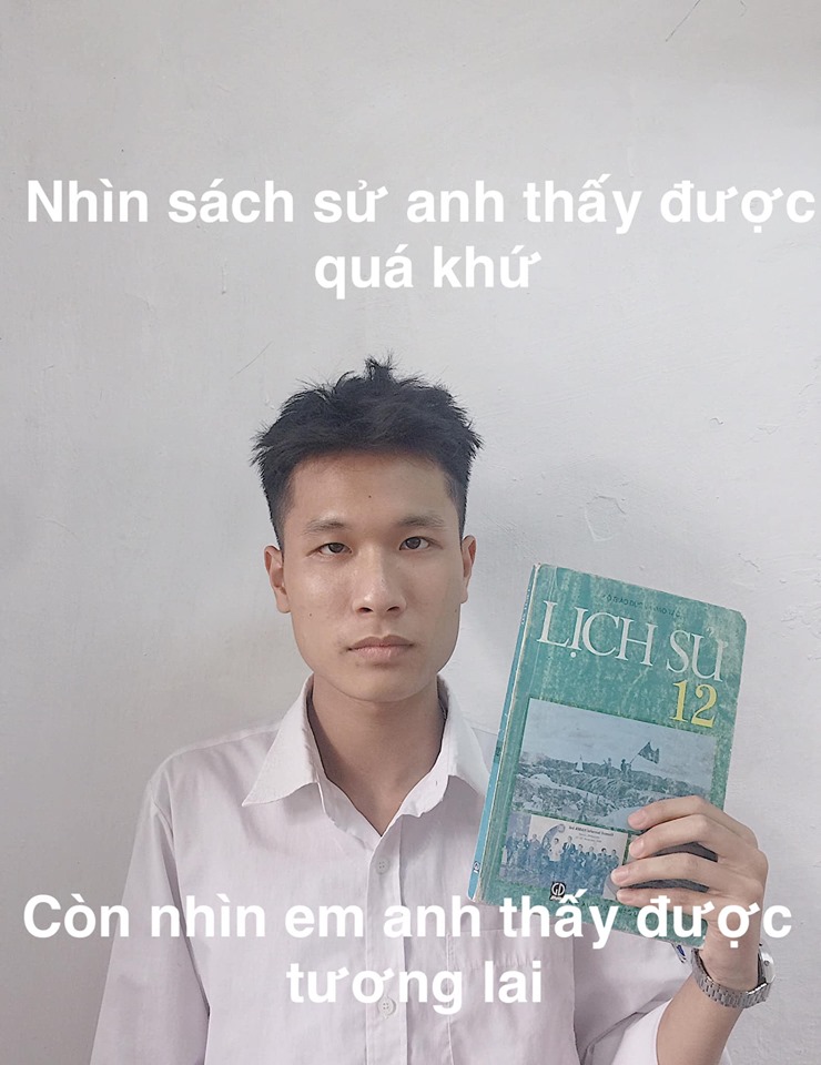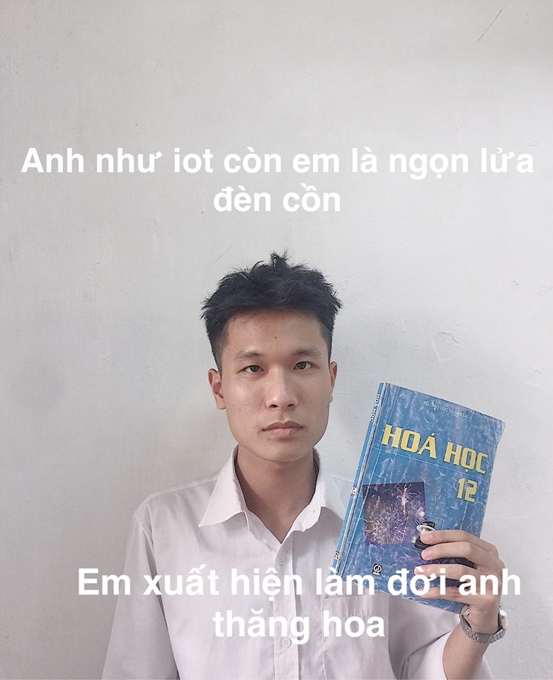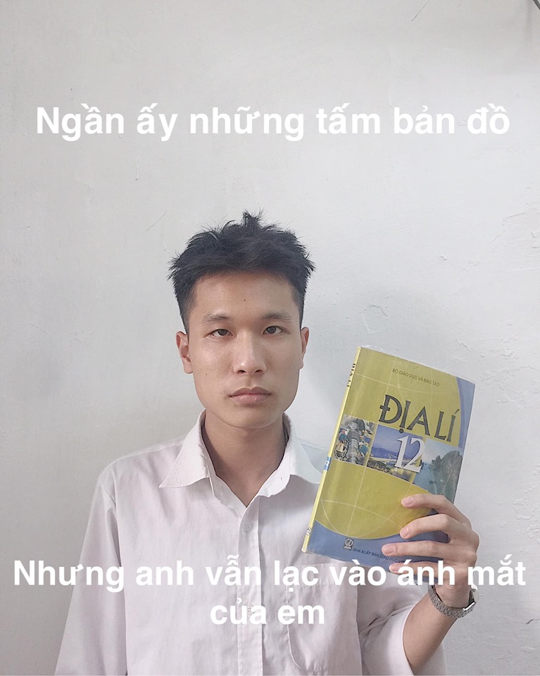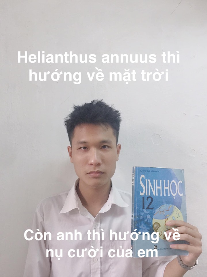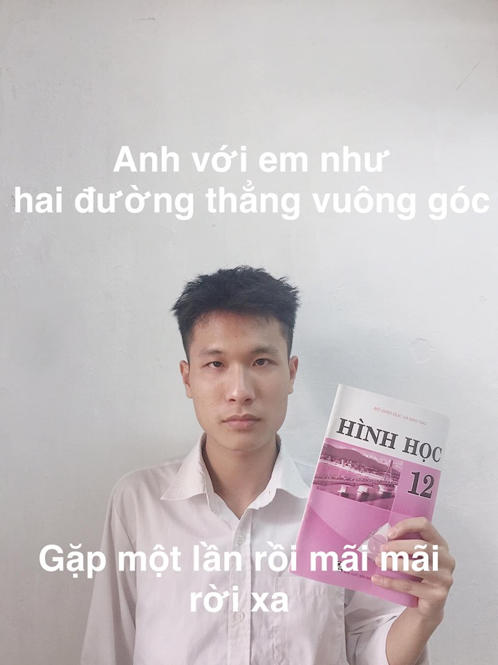 Mới đây, cộng đồng mạng được dịp dậy sóng bởi một loạt những hình ảnh chụp cùng với sách giáo khoa. Chỉ với một khuôn mặt duy nhất, nam thanh niên này đã ghi lại loạt những khoảnh khắc đáng nhớ bên cạnh quyển sách giáo khoa lớp 12. Thế nhưng đặc biệt hơn, gắn liền với những hình ảnh đó, nam sinh này còn cho ra đời những câu văn “thả thính” hài hước, phù hợp và gần gũi với nội dung của từng quyển sách giáo khoa.