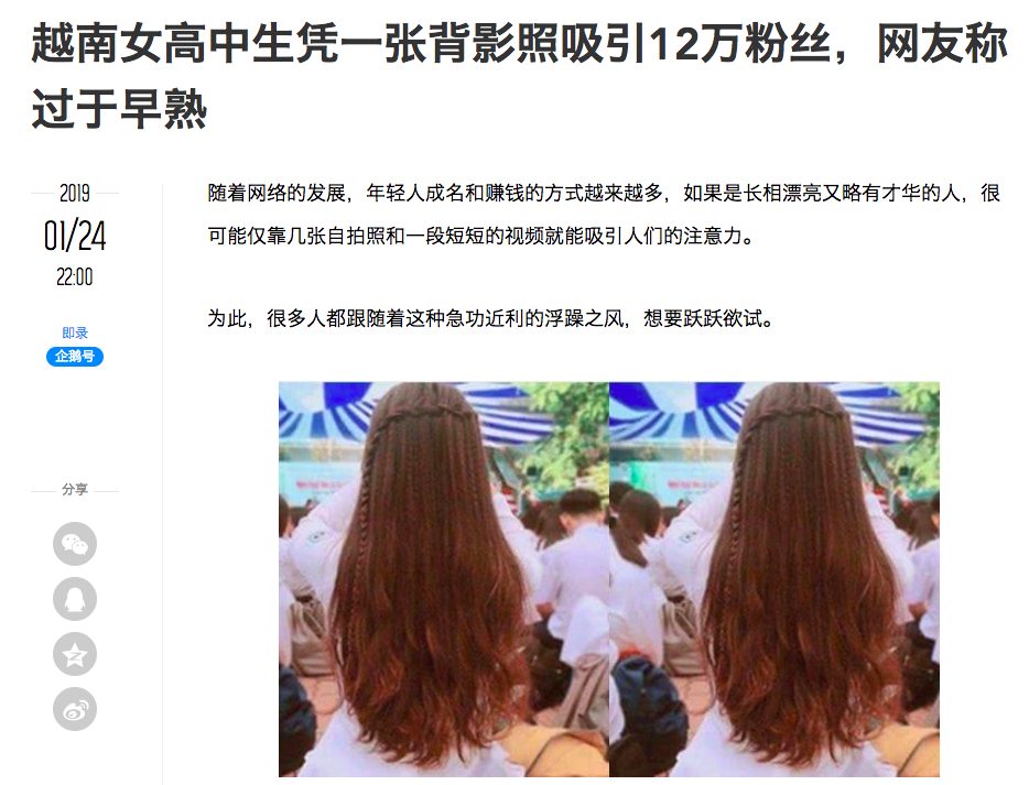 Cụ thể, khắp mạng xã hội ở Trung Quốc rầm rộ chia sẻ bức ảnh của Kiều Trang. Rất nhiều người dành những lời khen có cánh cho Kiều Trang. Một nickname viết: “Kiều Trang nổi đình đám trên mạng xã hội ở Việt Nam nhờ một bức ảnh chụp quay lưng, chỉ rõ mái tóc dài. Bức ảnh này đã mang về cho cô hơn 120.000 likes trên mạng xã hội. Kiều Trang chia sẻ mình thích tóc dài nên đã nuôi tóc từ bé.”