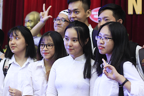 Lê Quỳnh Anh bên các bạn lớp Sư phạm Toán dạy bằng tiếng Anh trong ngày khai giảng. Ảnh: Dương Tâm