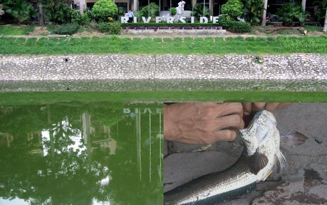 Sau đợt mưa dài ngày, nước sông Tô Lịch (Hà Nội) dâng lên mức 4 m và đổi màu xanh ngắt. Nhiều người câu được hàng chục con cá trong vài giờ.