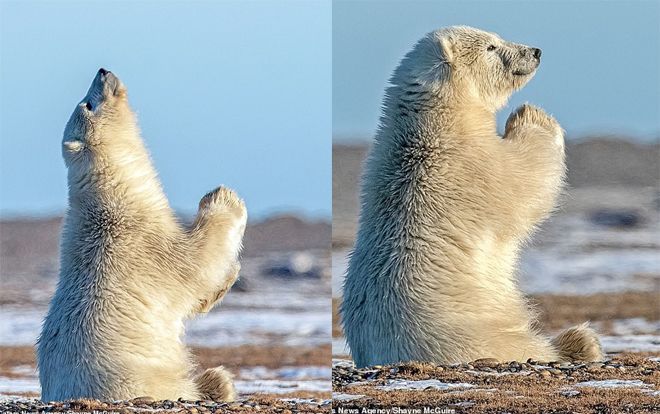 Hình ảnh chú gấu Bắc Cực đưa bàn tay to tướng lên chắp lại nhìn trời như cầu nguyện đầy trong trẻo và tinh khôi đang được mạng xã hội chia sẻ với nhiều suy ngẫm.