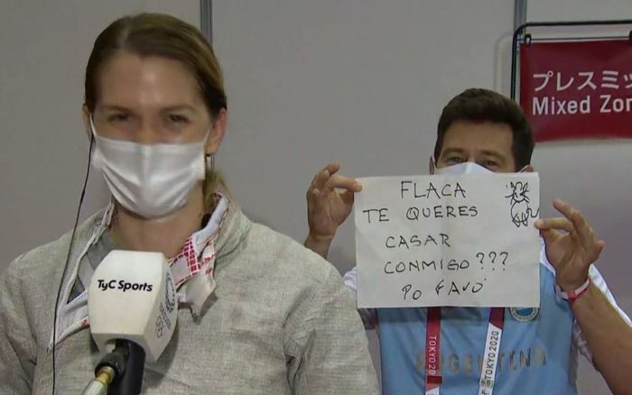 Nữ vận động viên đấu kiếm Maria Belen Pérez Maurice người Argentina được HLV Lucas Saucedo ngỏ lời cầu hôn khi cô đang trả lời phỏng vấn truyền hình.