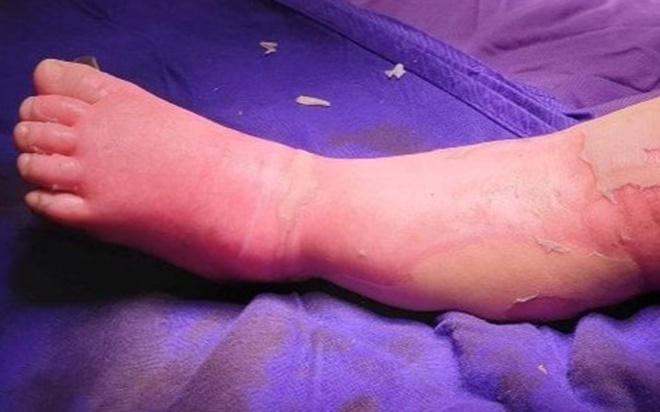Bé trai 9 tháng tuổi không may bị bỏng nước sôi ở vị trí đùi và cẳng chân phải. Gia đình không chưa cháu đến bệnh viện điều trị mà đưa con đến nhà bà lang gần nhà để đắp thuốc.