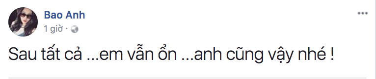 Tối 18/10, trang Facebook cá nhân của Bảo Anh được mở lại sau hơn một ngày khoá tài khoản. Đáng chú ý, nữ ca sĩ chia sẻ dòng trạng thái khiến người hâm mộ đoán rằng cô đang gửi lời nhắn đến nam ca sĩ Hồ Quang Hiếu dù không chỉ đích danh đến ai.