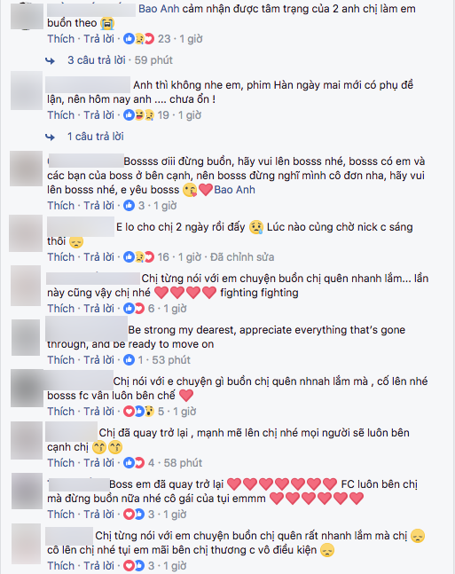 Dòng trạng thái của Bảo Anh ngay lập tức nhận được hàng ngàn lượt bấm thích và bình luận từ cư dân mạng cũng như là bạn bè, đồng nghiệp. Mọi người đều để lại lời chia sẻ, động viên dành cho nữ ca sĩ sinh năm 1992, hy vọng cô sẽ cố gắng vượt qua giai đoạn khó khăn này.