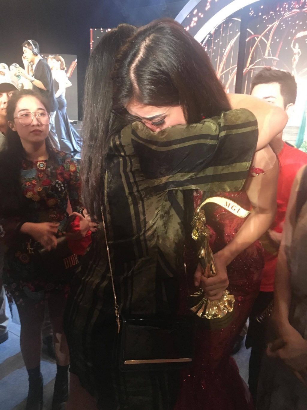 Huyền My trong vòng tay của bố mẹ sau đêm chung kết.