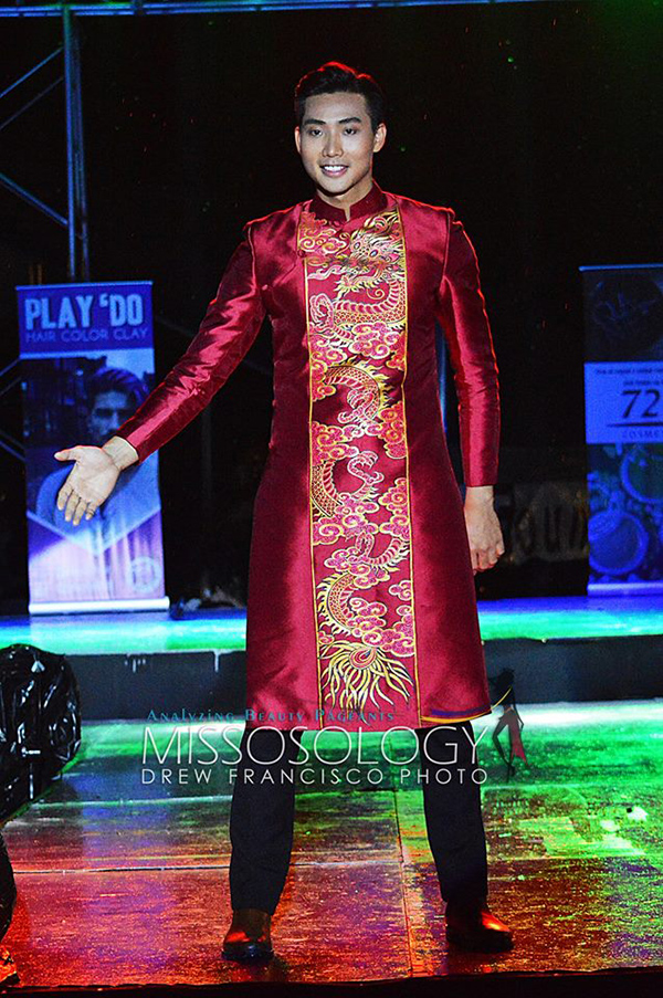 Hữu Long trong phần trình diễn trang phục dân tộc mới đây. Nam siêu mẫu chọn tà áo dài truyền thống.