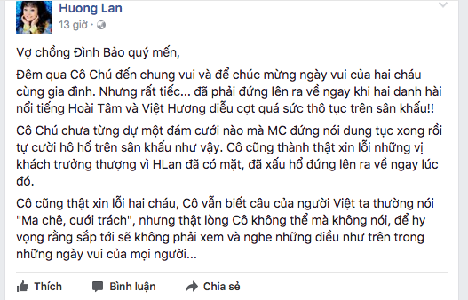 Cô cũng thật xin lỗi hai cháu, cô vẫn biết câu của người Việt ta thường nói “Ma chê, cưới trách”, nhưng thật lòng cô không thể mà không nói, để hy vọng rằng sắp tới sẽ không phải xem và nghe những điều như trên trong những ngày vui của mọi người….” - danh ca Hương Lan gửi lời xin lỗi hai vợ chồng Đình Bảo.
