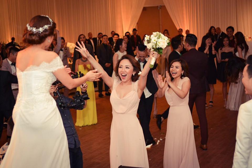 Tóc Tiên bay sang Mỹ để chúc phúc cho người anh thân thiết. Cô vô cùng hạnh phúc đi nhận được boá hoa từ cô dâu.