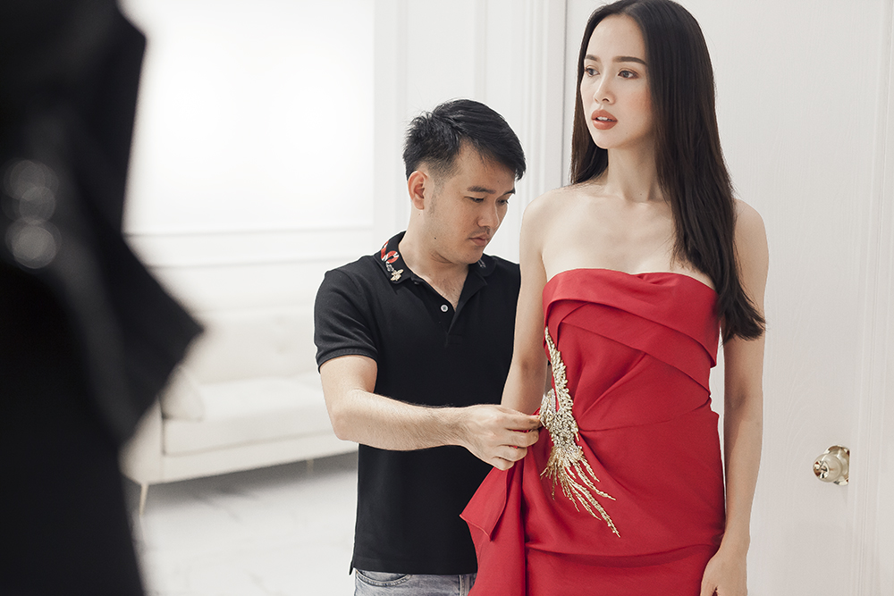 Bên cạnh chiếc đầm xanh, NTK Lê Thanh Hòa cũng chọn thêm cho cô chiếc đầm ngắn, cúp ngực màu đỏ với điểm nhấn xếp vạt ở chân váy và thắt eo bằng cánh phượng hoàng đính kết quý phái.
