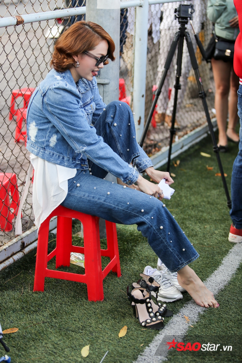 Cô thay giày thể thao để tiện tham gia các trò chơi trong chương trình.
