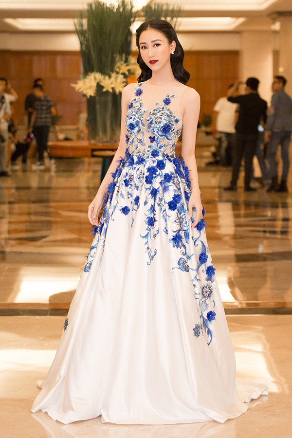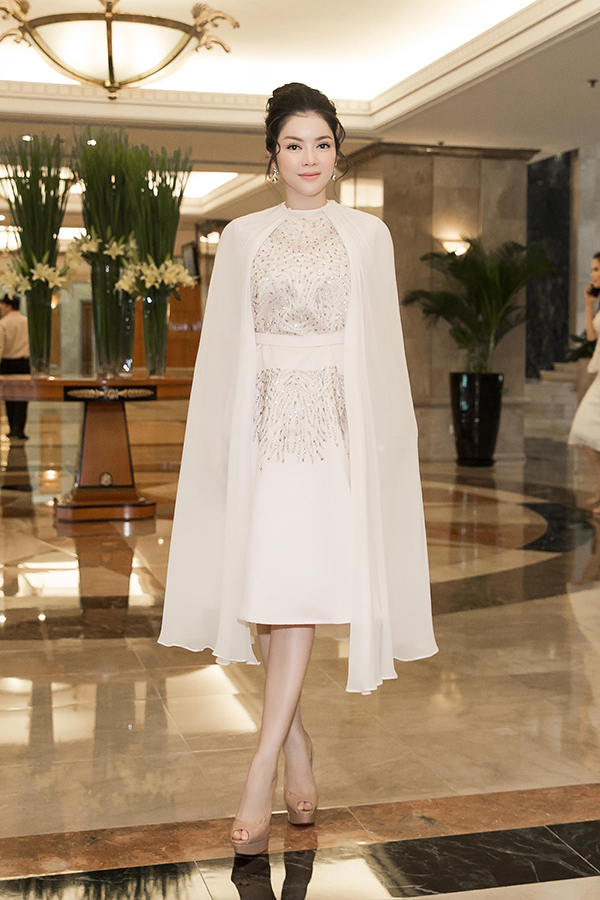 Cô diện set đồ với đầm Dice Kayek màu hồng phấn với áo choàng làm toát lên thần thái sang trọng quý phái hiếm có. Tô điểm thêm cho nhan sắc ấy là bộ nữ trang kim cương, nhẫn đeo tay đến từ các thương hiệu Paolo Piovan, Crivelli và bông tai của De Grisogono.