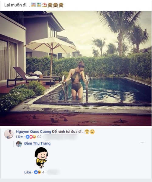Cụ thể, vừa qua, trên trang cá nhân, Đàm Thu Trang chia sẻ hình ảnh diện bikini bên hồ bơi cực gợi cảm cùng dòng chú thích: “Lại muốn đi”. Đáng chú ý, phía dưới bài viết, Cường Đô La không chỉ nhấn “like” mà còn để lại bình luận: “Để rảnh tui đưa đi”.