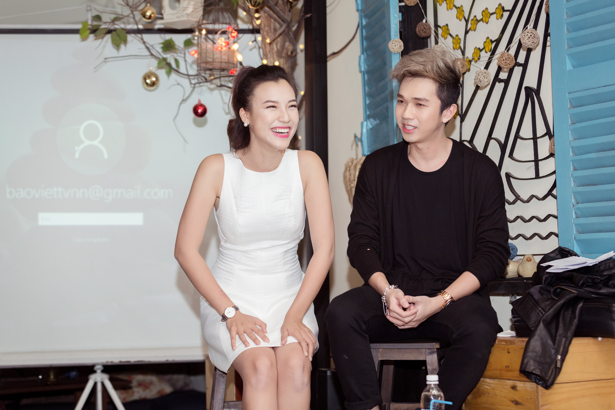 Người đẹp sánh đôi cùng bạn trai - nam diễn viên Huỳnh Anh tới buổi fan meeting đầu tiên trong sự nghiệp.