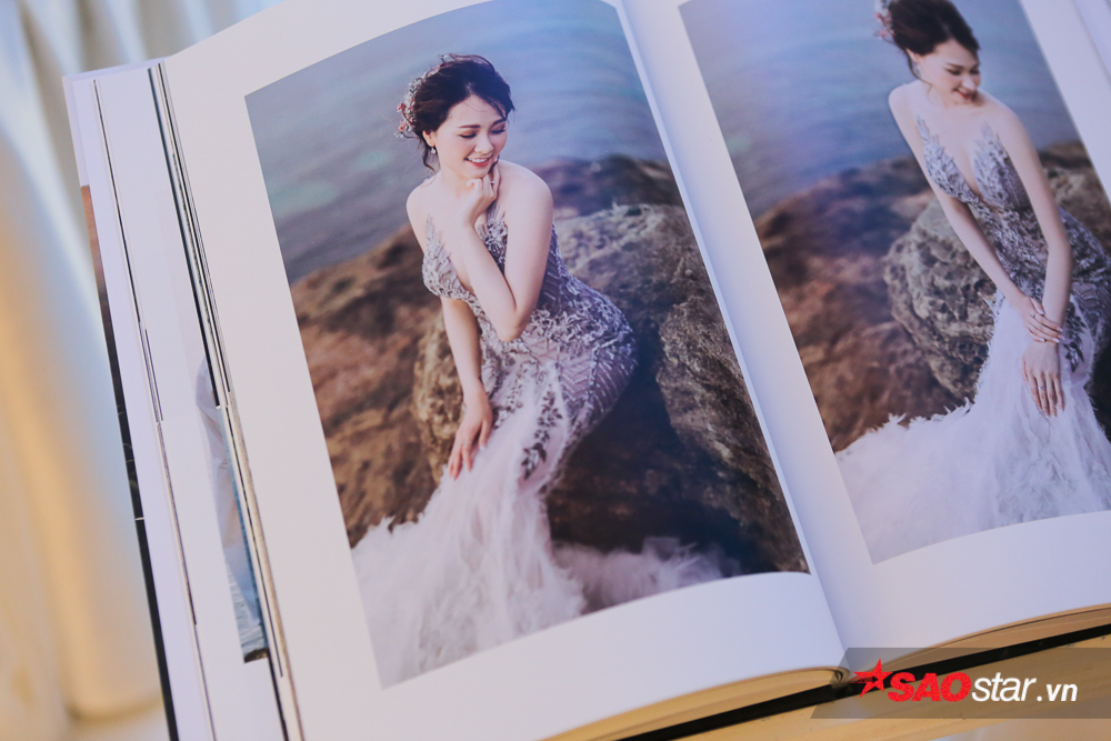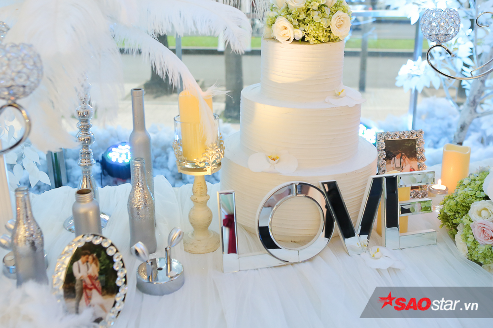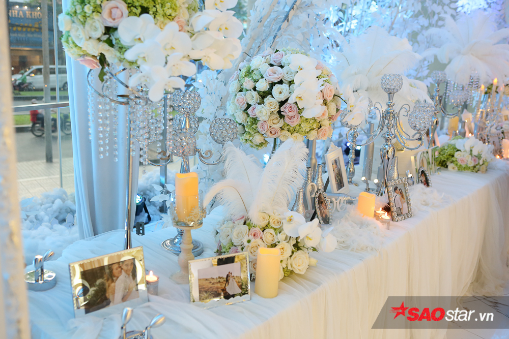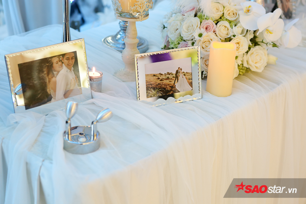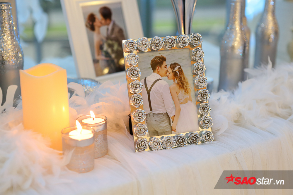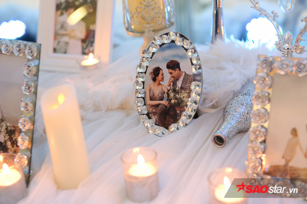 Bàn tiếp khách được trang trí bởi những khung ảnh hình cô dâu chú rể, điểm tô thêm là ánh nên lung linh, mờ ảo.