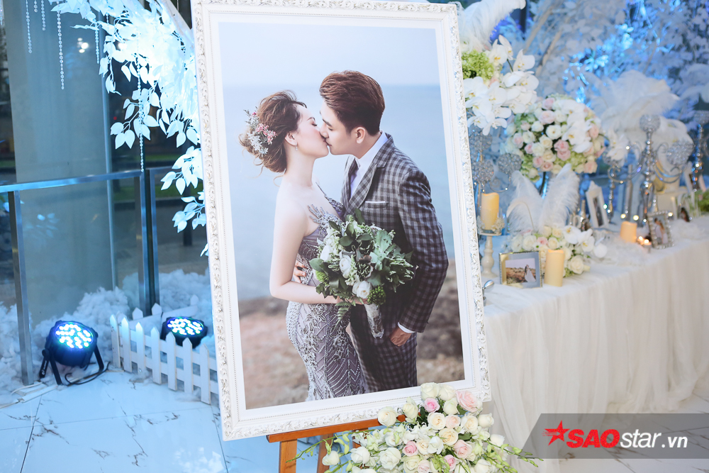 Hình ảnh hạnh phúc của Huy Nam bên bà xã xinh đẹp được trang trí khắp sảnh tiệc.