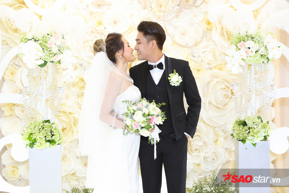 Huy Nam hạnh phúc hôn môi cô dâu trong sự hò reo của mọi người.