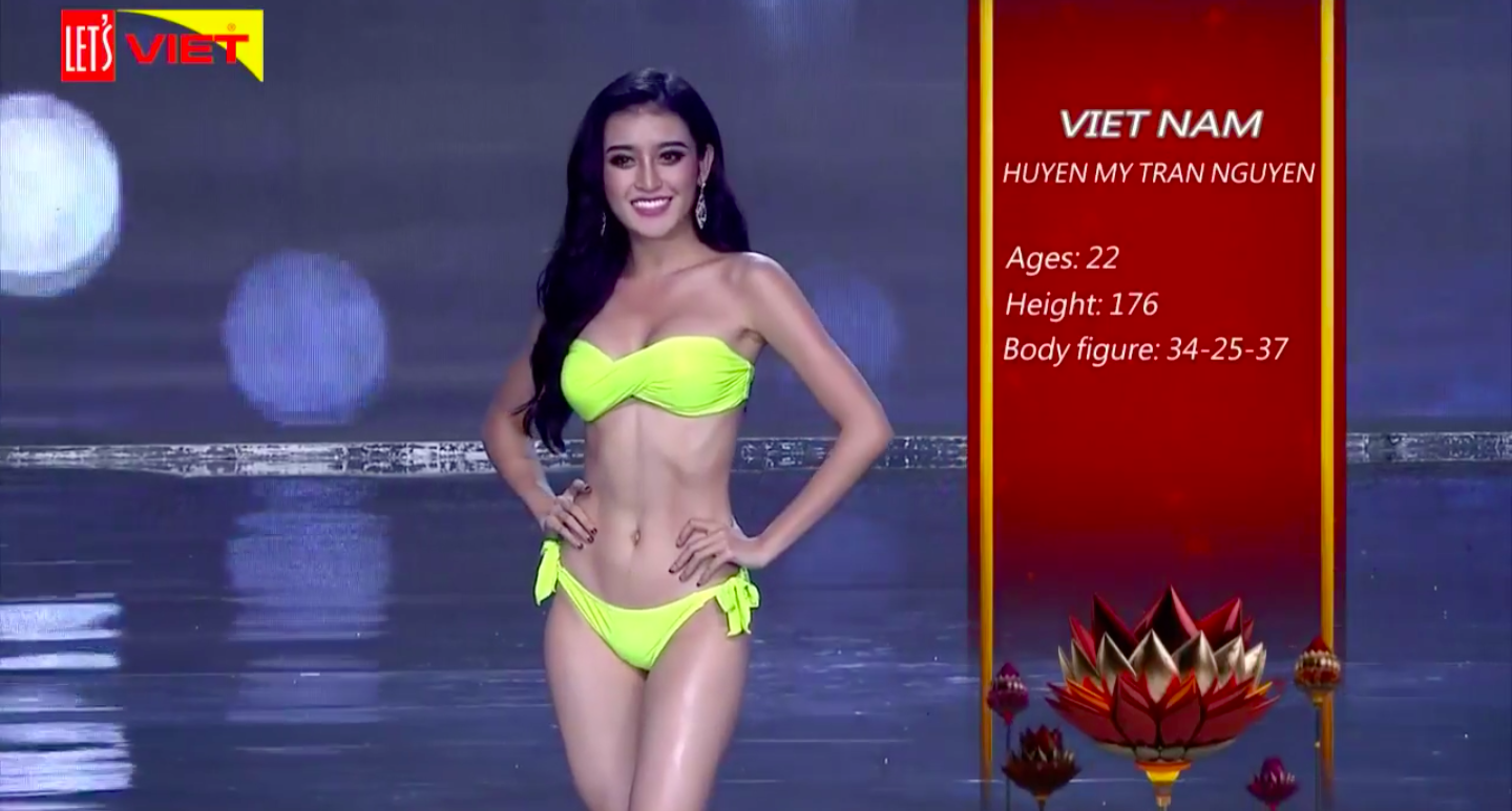 Người đẹp sinh năm 1995 tự tin catwalk trong trang phục dạ hội lộng lẫy. Không đánh mất phong độ, Huyền My đẹp như nữ thần với phong cách sang trọng, quý phái cùng thần thái rạng rỡ trên sân khấu. Cô hô to, dõng dạc tên mình và đất nước Việt Nam, trong tiếng hò reo từ đông đảo khán giả.