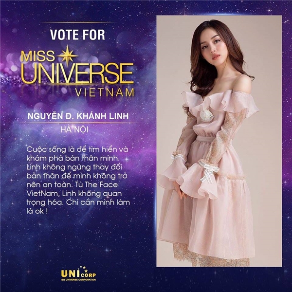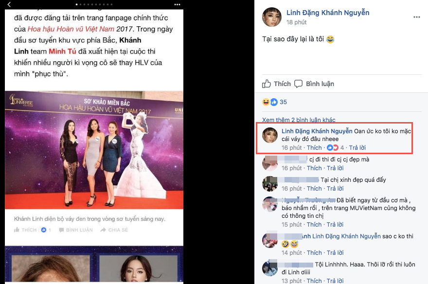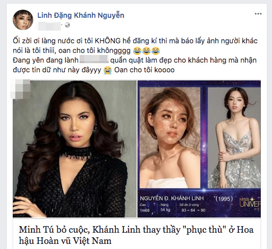 Mới đây, trên Facebook cá nhân của mình, Khánh Linh - team HLV Minh Tú bất ngờ cập nhật dòng trạng thái khá bức xúc. Theo đó, Khánh Linh khẳng định mình không đăng ký thi Hoa hậu Hoàn vũ Việt Nam 2017 như một trang tin đã đăng tải.