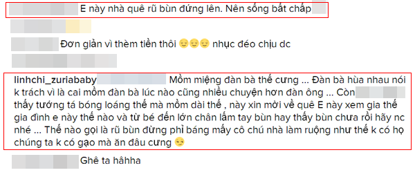 Bên cạnh những lời chúc mừng cặp đôi mãi hạnh phúc bên nhau thì rất nhiều bình luận “ném đá” Linh Chi ngay trong bức ảnh cô chia sẻ. Trong đó có một anti-fan thẳng thắn chê là “gái nhà quê rũ bùn đứng lên nên sống bất chấp”, điều này khiến Linh Chi không khỏi tức giận. Ngay lập tức, cô đanh thép đáp trả: “Mồm miệng đàn bà thế cưng. Đàn bà hùa nhau nói không trách vì là cái mồm đàn bà lúc nào cũng nhiều chuyện hơn đàn ông. Còn bạn thấy tướng tá bóng loáng mà mồm dài thế. Xin mời về quê em này xem gia thế thế nào và từ bé đến lớn chân lấm tay bùn hay thấy bùn chưa rồi hãy nói chuyện nhé. Thế nào gọi là rũ bùn, đừng phỉ báng mấy cô chú làm ruộng như thế. Không có họ chúng ta không có gạo mà ăn đâu cưng”.