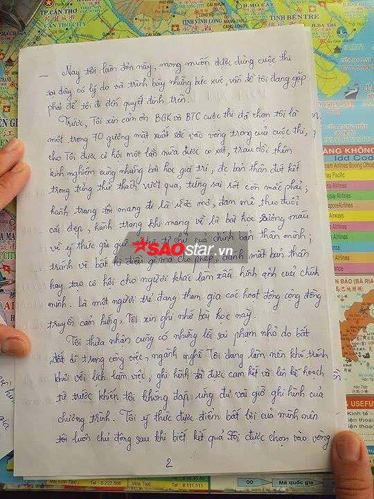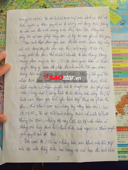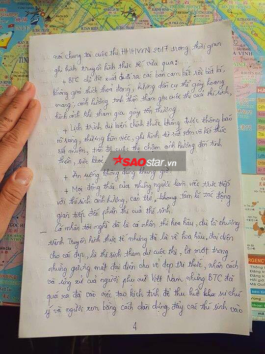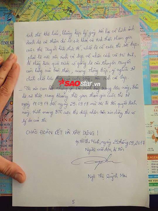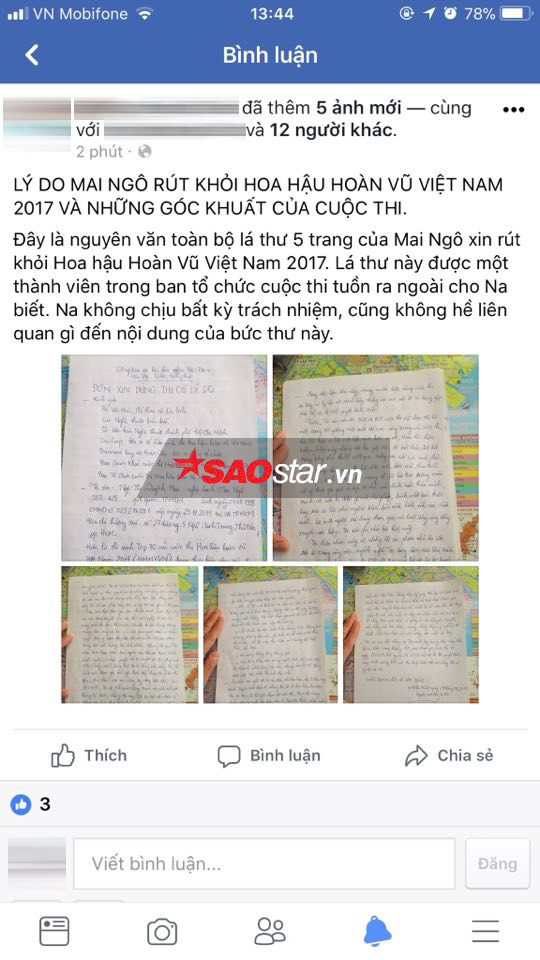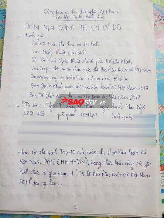 Một cư dân mạng bất ngờ chia sẻ hình ảnh chụp lại toàn bộ lá thư của Mai Ngô trình bày về lý do rút tên khỏi cuộc thi Hoa hậu Hoàn vũ Việt Nam 2017.